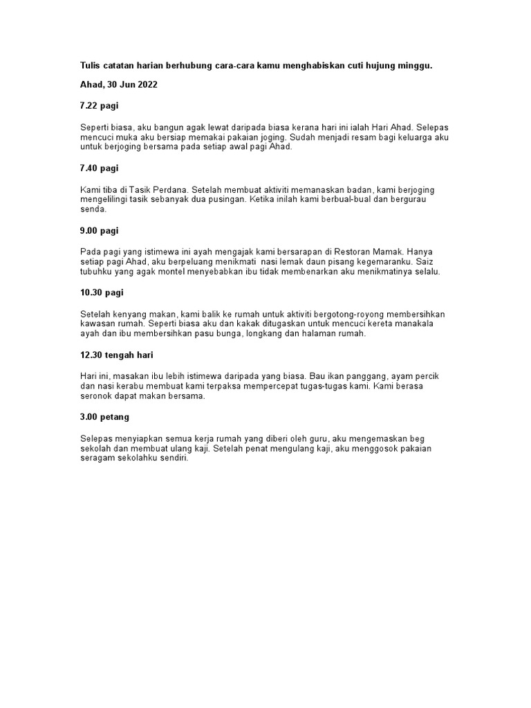 CONTOH KARANGAN AKIVITAS SEHARI HARI Sebagian orang suka menceritakan kegiatan sehari harinya didalam buku catatan. Namaku Desika Sartika biasa dipanggil Tika aku lahir di Kisaran tepat pada tanggal 7 Februari 2002. Contoh karangan upsr laporan lawatan ke melaka.